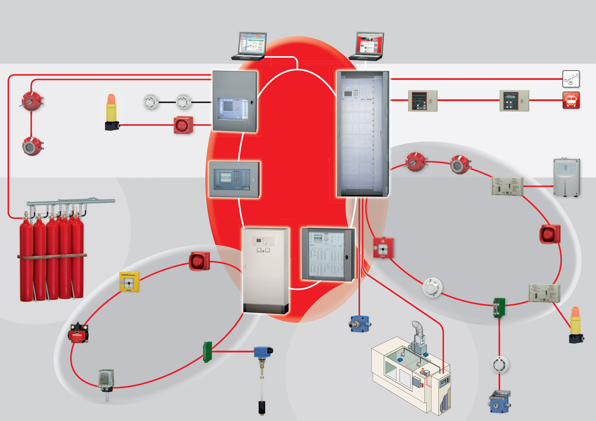 Painéis de controle de detecção e extinção de incêndio processam resultados detectados por sensores, controlam dispositivos de alarme e disparam os alarmes para pontos com a presença permanente de pessoal e para a central do corpo de bombeiros civis. Eles monitoram continuamente os sistemas de extinção de incêndio quanto a sua funcionalidade e os acionam eletricamente, se necessário. Além disso, eles comunicam-se com sistemas de gerenciamento de riscos ou através de interface via web com dispositivos com acesso à Internet. Diferentes versões de modelos, desde um painel compacto de pequeno porte até sofisticados painéis de controle de grande porte possibilitam escolher o painel de controle de detecção e extinção de incêndio ideal.