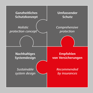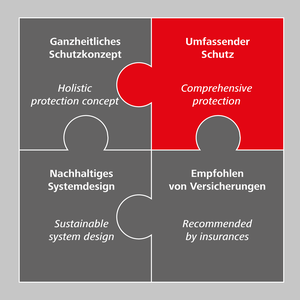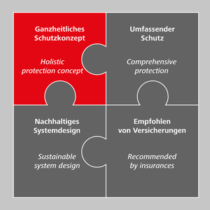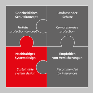PVProtect therefore uses a holistic protection concept to shield lives and property from fire damage caused by PV systems: linear heat detectors monitor the area below the photovoltaic modules for unusual temperature increases. This allows for fires to be detected early and located accurately. In the event of a fire, PVProtect automatically initiates the suppression to prevent uncontrolled spreading. Simultaneously, the system alerts the emergency services and distributes a warning signal for people on site to enable safe evacuation of affected areas.