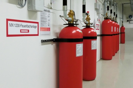 Halocarbon extinguishing systems fight fires using the chemical extinguishant FK 5-1-12 or MX200 with the chemical extinguishant HFC-227ea. This extinguishant is neither corrosive nor electrically conductive. It is thus especially suitable for protecting rooms containing electric and electronic equipment. The systems extinguish fires without leaving residue, while offering a high level of personal and environmental protection at the same time. They are particularly suitable for the protection of small and medium-sized rooms, and the extinguishing agent can be stored compactly, either inside the room or in another area.